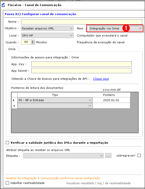 Na tela Fiscal.io – Canal de Comunicação (Passo 01), preencha: