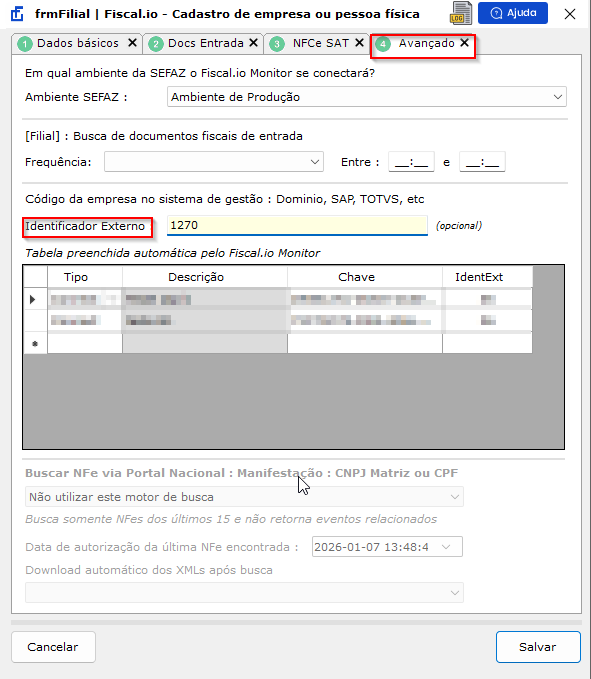 Conferir (ou preencher) o Identificador Externo no cadastro de empresa