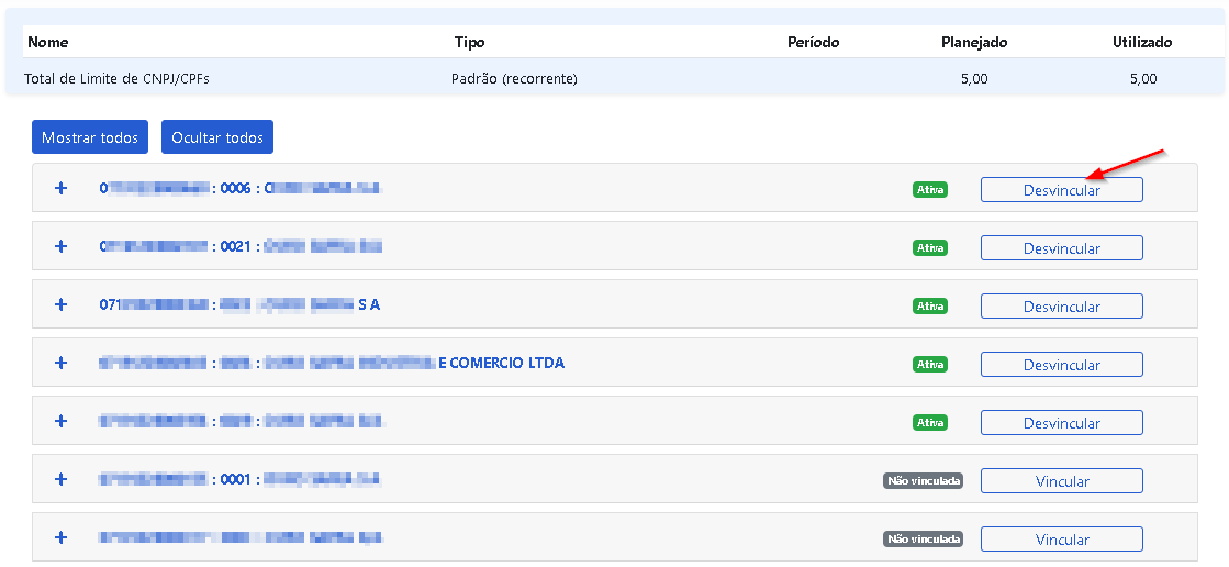 Vincular ou desvincular um CNPJ/CPF permite gerenciar quais empresas terão direito de uso, sempre respeitando o limite definido pelo seu plano.