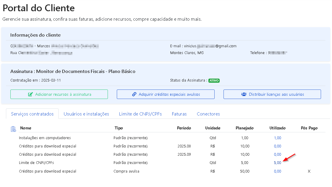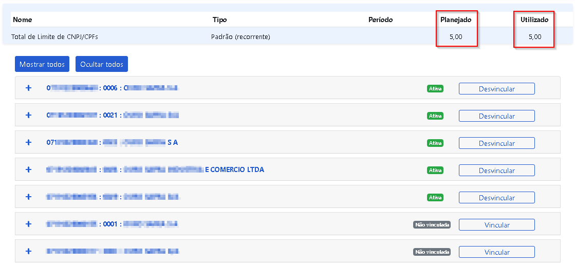Analise a quantidade de CNPJ/CPF que você tem disponível e a quantidade de CNPJ/CPF em uso.